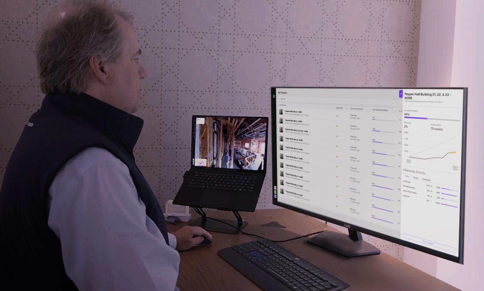 Leveraging our database of 4 billion images and cutting-edge AI tools, our computer vision engine pulls layers of information from captured images by our capture specialist network, mapping to your floor plans and tracking progress. So you can monitor up to 24 trades across 8 asset classes.